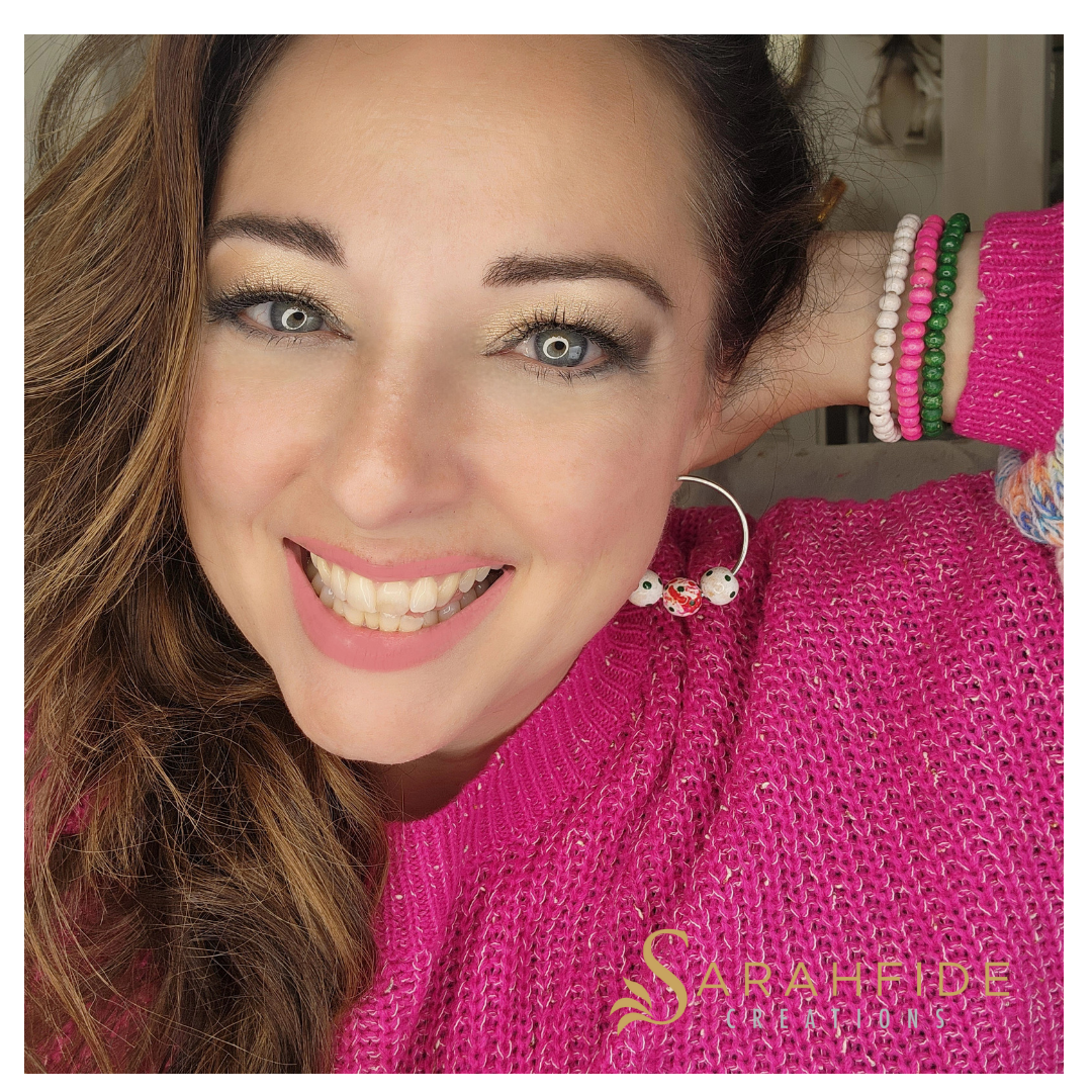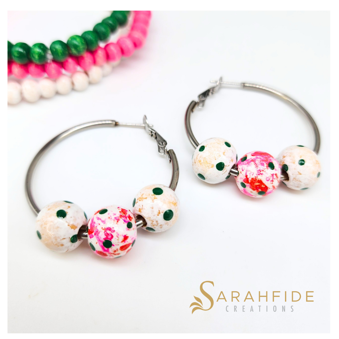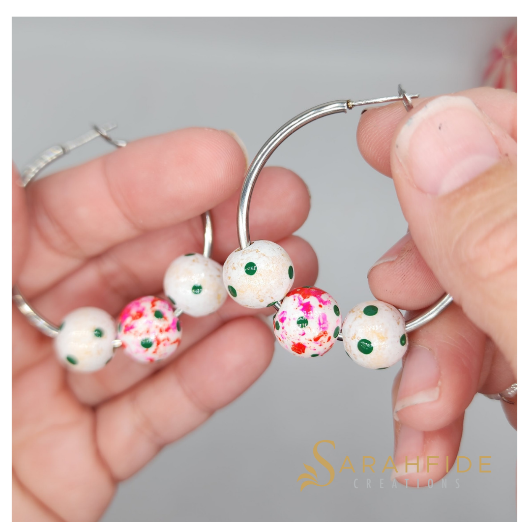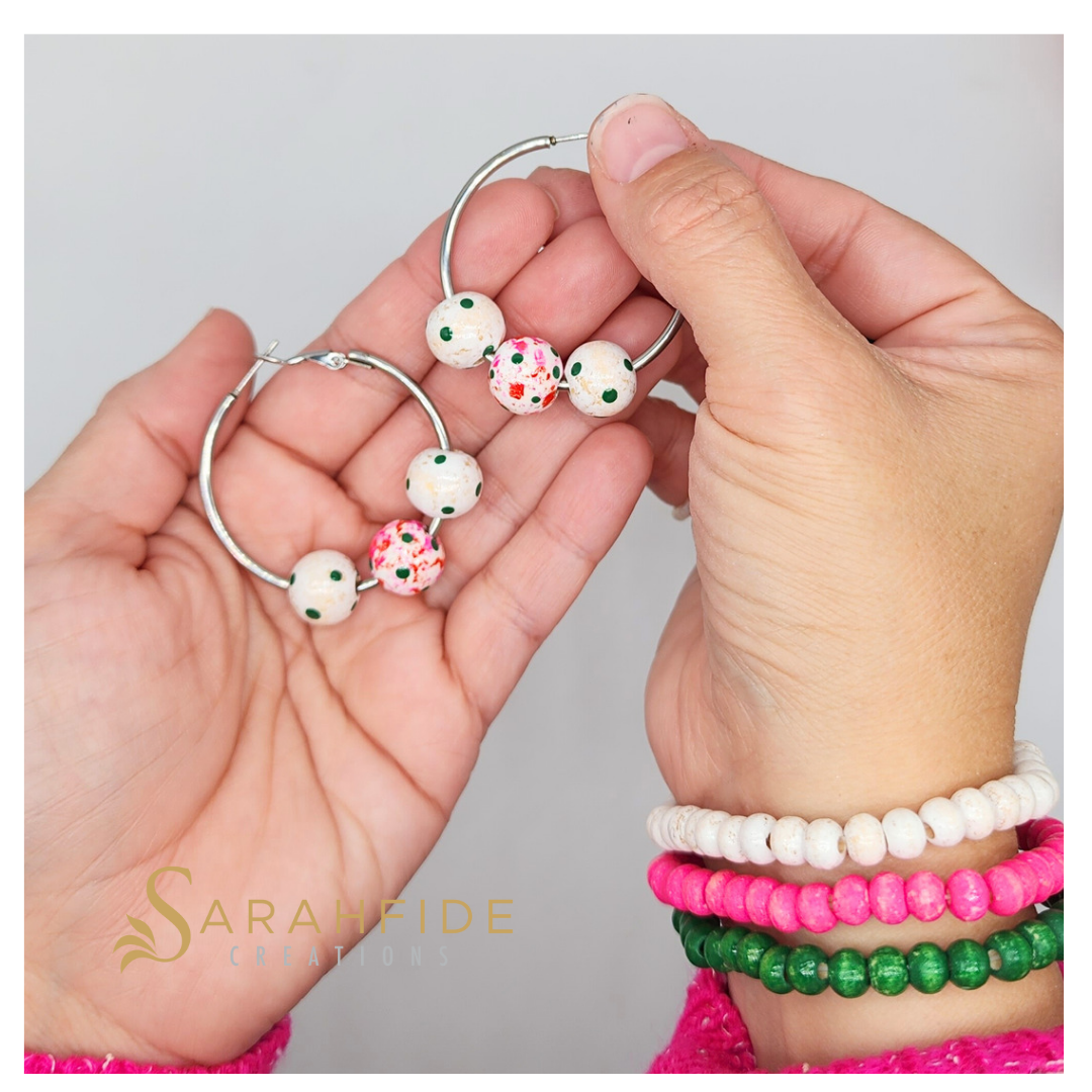 Red and green, with a splash of pink and polka dots, come together in these Christmas hoops to create a festive and whimsical accessory. Perfectly capturing the holiday spirit, the vibrant colors and playful patterns make these earrings a joyful addition to any seasonal outfit.